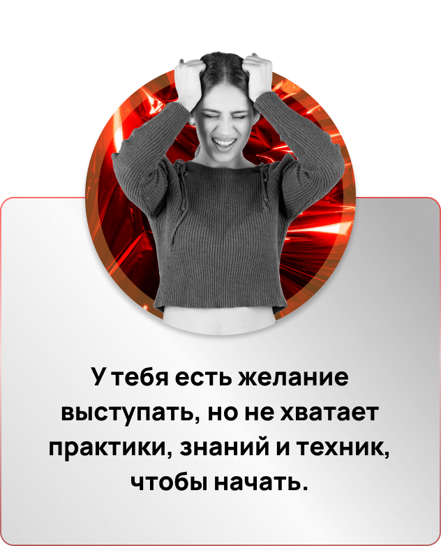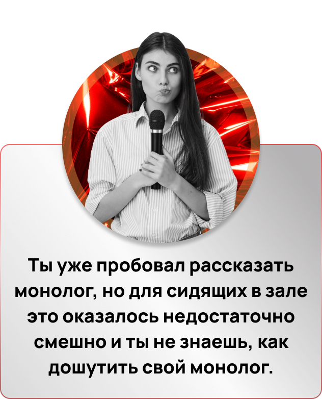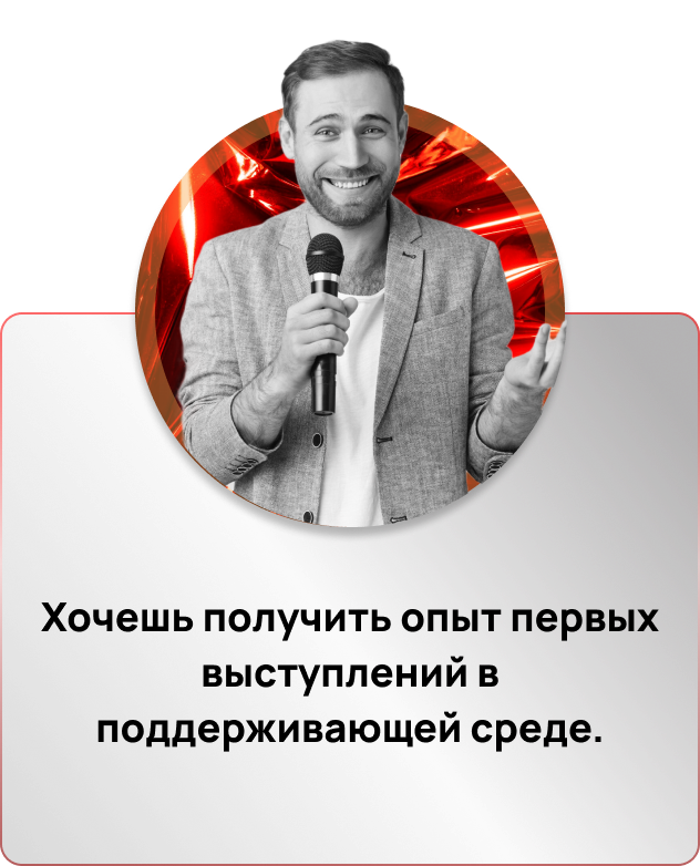 Ты получишь пошаговый план от стендап ментора Сони Раит о том, как построить свое первое выступление, эффективно выступать на сцене и расположить к себе аудиторию.